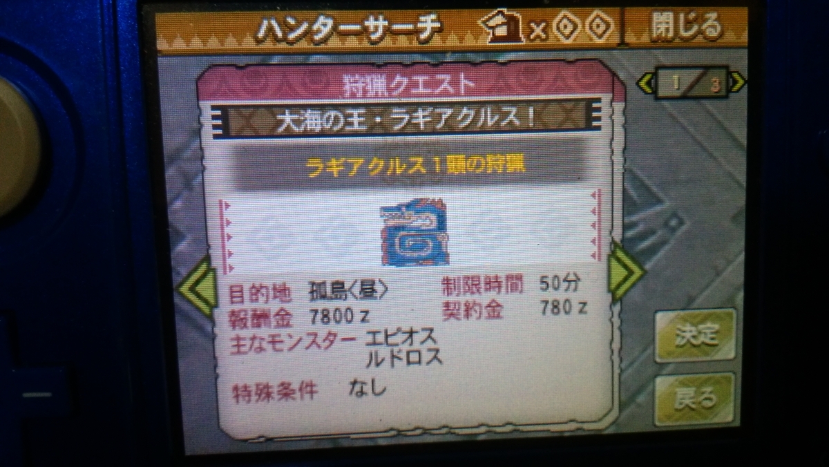 港ラギア、今なら行けるかと挑みましたがチャチャもおらず乙りました。それでそうそうクエスト進めなきゃの「迷子の鬼面族」でした。昨日と一昨日はそれぞれトルネコ3異世界とカプエス2を遊びましたから、3日ぶりのモンハンです。なんで一気にやらんの?と思われる方もいらっしゃると思いますが、やると疲れて次々とならんのです。集中力いりますからね。それで以前は冒険に出る前に何度もアイテム確認して、ベッドでセーブすると外から「すぐ寝るー!」とか声がして。うるせーよ!俺が部屋でゲームしてる音を盗み聞きしてチャチャ入れんじゃねぇよ!と思っていますが、病院行くと空耳ですねとおくすり出されますヨ!言ってるヤツ、いると思うんだ。女の声で。