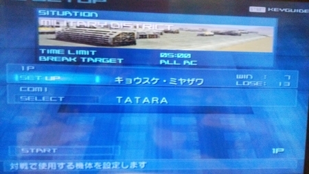 そうして挑んだTATARA戦は轟5勝5敗のセーブデータから2勝8敗で計7勝13敗まで引き離されてしまった。装備はクリア装備。右バズーカ左ライフル肩レーダーと簡単に言ってその詳細も山ほどあるんだけど・・・。